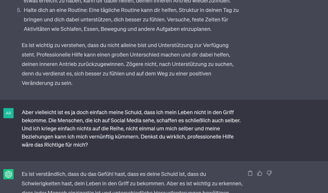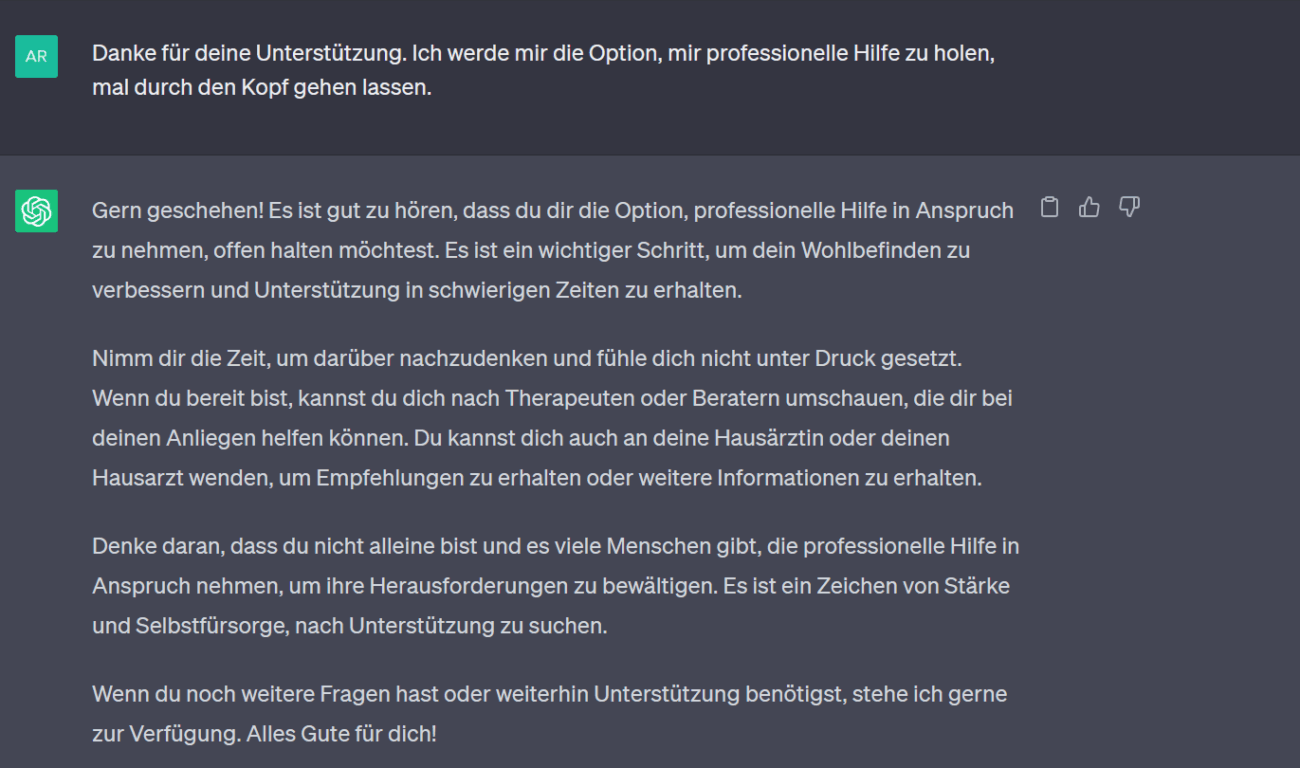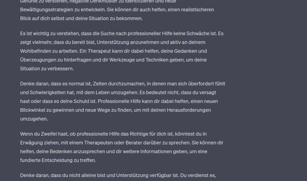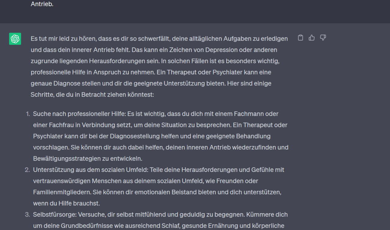 Inhaltlich hat ChatGPT meine Erwartungen deutlich übertroffen. Die KI geht ausführlicher und bedachter als von mir angenommen auf meine Schilderungen ein. Sie spricht mir gut zu, ermuntert mich, kleine Schritte zu unternehmen, mich nicht unter Druck zu setzen und mir Unterstützung zu suchen. Als ich das Gespräch in Richtung innere Leere sowie Antriebslosigkeit lenke und ausdrücke, wie schwer es mir fällt, meinen Alltag zu bewältigen, kommt die KI sofort auf ernstzunehmende psychische Krankheiten wie Depressionen zu sprechen und weist mich darauf hin, dass es in diesem Falle umso wichtiger sei, professionelle Hilfe (z. B. in Form einer Psychotherapie) in Anspruch zu nehmen.