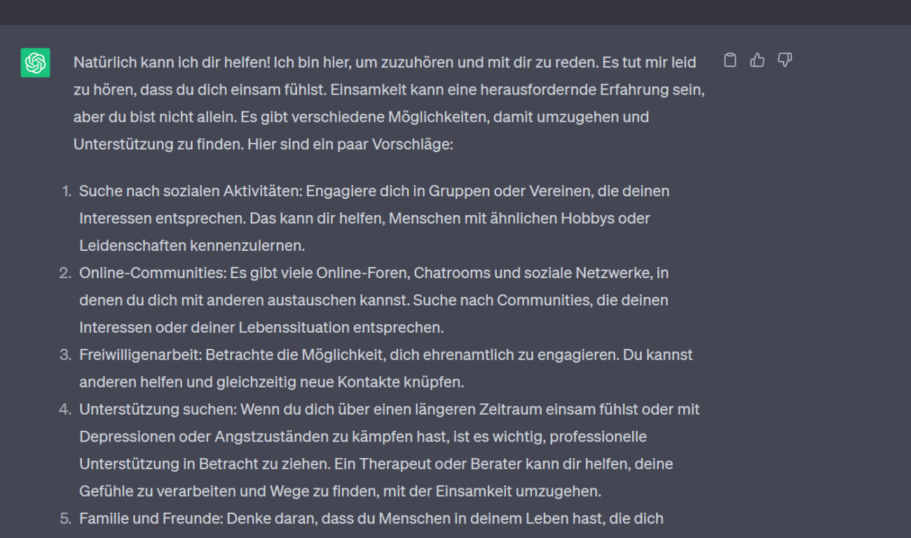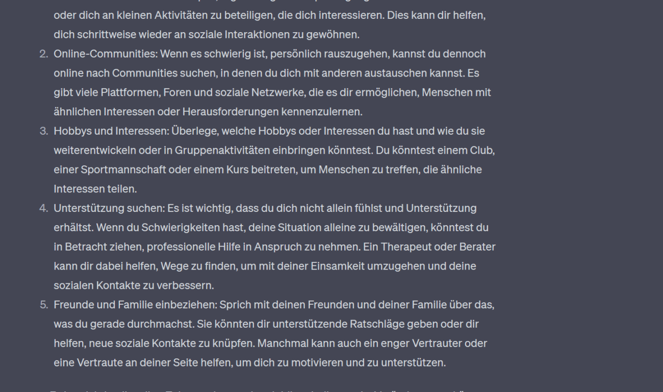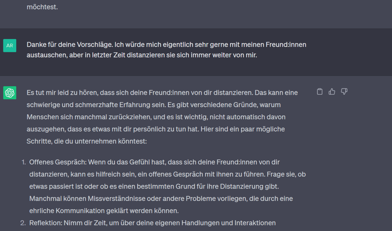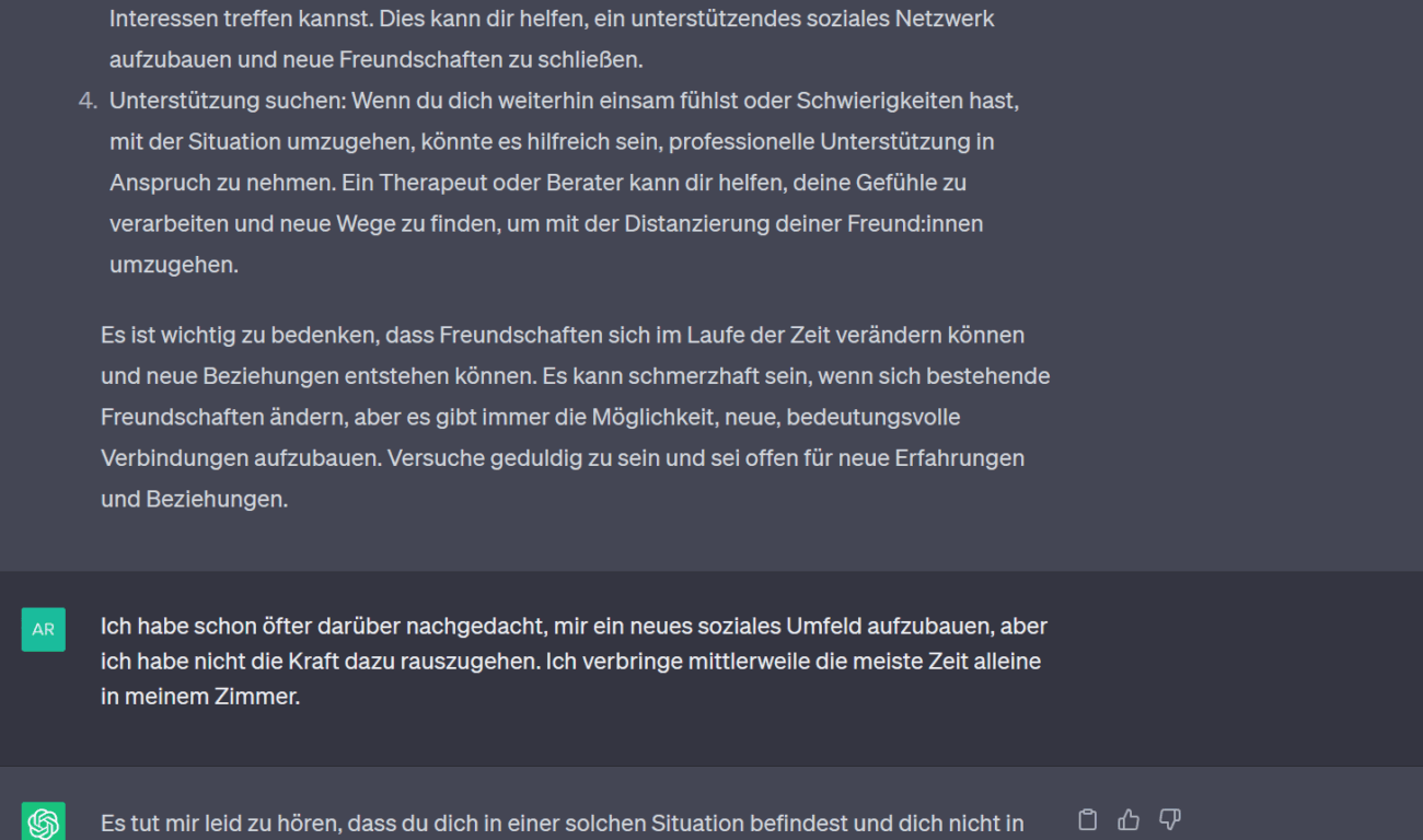 Inhaltlich hat ChatGPT meine Erwartungen deutlich übertroffen. Die KI geht ausführlicher und bedachter als von mir angenommen auf meine Schilderungen ein. Sie spricht mir gut zu, ermuntert mich, kleine Schritte zu unternehmen, mich nicht unter Druck zu setzen und mir Unterstützung zu suchen. Als ich das Gespräch in Richtung innere Leere sowie Antriebslosigkeit lenke und ausdrücke, wie schwer es mir fällt, meinen Alltag zu bewältigen, kommt die KI sofort auf ernstzunehmende psychische Krankheiten wie Depressionen zu sprechen und weist mich darauf hin, dass es in diesem Falle umso wichtiger sei, professionelle Hilfe (z. B. in Form einer Psychotherapie) in Anspruch zu nehmen.
