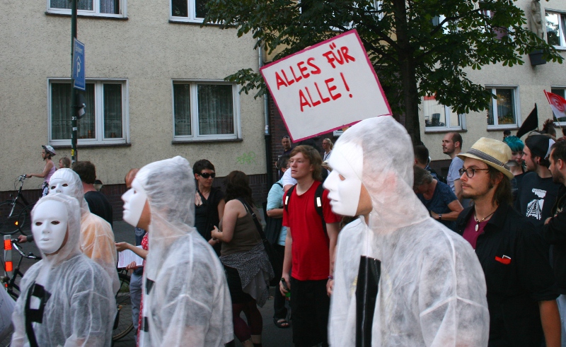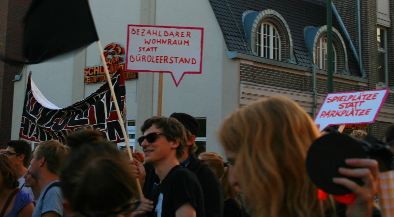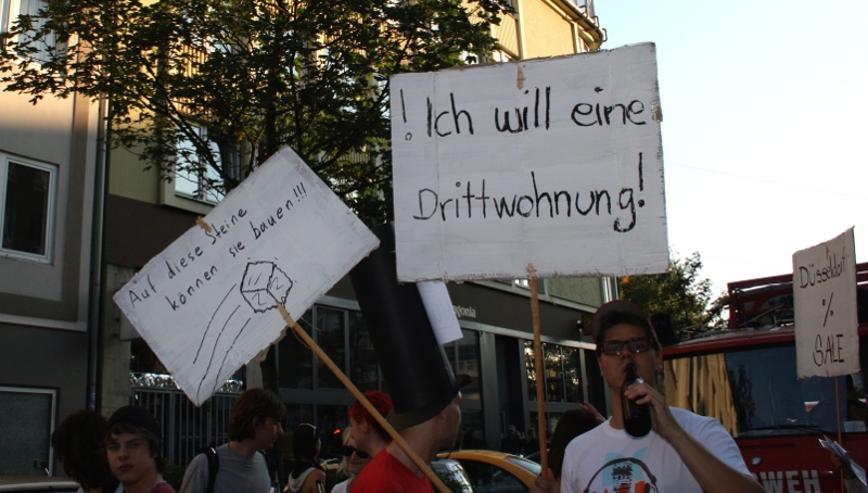 Die Demonstranten kritisierten, dass angesagte Stadtteile immer teurer werden und zu viele Luxuswohnungen gebaut werden. Finanziell schwächere Düsseldorfer würden dadurch vertrieben. Obwohl 700.000 Quadratmeter Bürofläche leer stehen würde, baute die Stadt weitere "gläserne Büropaläste", hieß es in dem Veranstaltungsflyer.