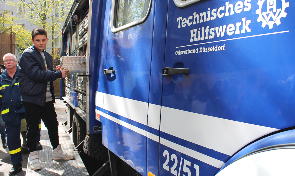 Besonders spannend finden die Schüler den THW-Wagen auf dem Schulhof. Natalia (15) schnappt sich direkt die Motorsäge. Sie ist fasziniert davon, was Ehrenamt alles sein kann.