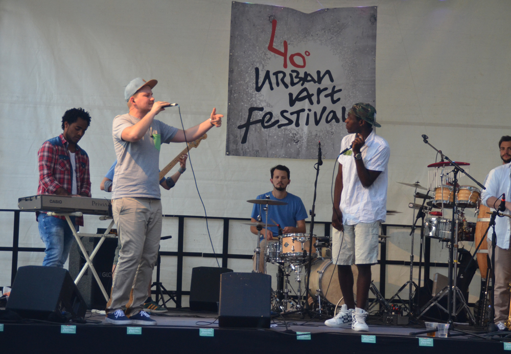 Nur nach und nach füllte sich der Gustaf-Gründgens-Platz vor dem Schauspielhaus mit Besuchern. Aber spätestens mit den Musik-Acts ging das Streetart-Festival am Freitagabend richtig los. Gegen 20 Uhr trat die neunköpfige Hip-Hop/Funk-Band Colektivo auf. Sie stimmte auf das Festival ein, das bereits am ersten Wochenende künstlerische Spuren hinterließ.