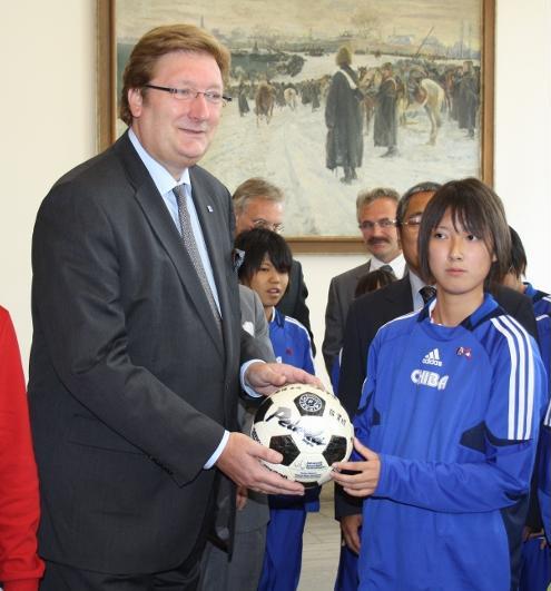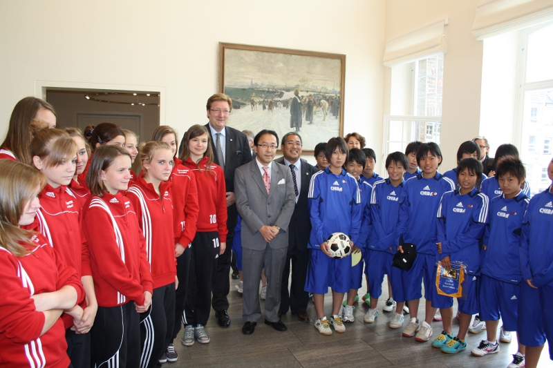 Oberbürgermeister Dirk Elbers hat am Montag eine U-15-Mädchenmannschaft aus Chiba, Japan, im Rathaus empfangen.